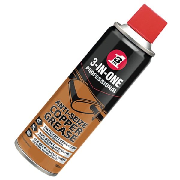 3-IN-ONE Anti-seize Copper Grease is a high temperature lubricant and anti-seize compound that protects metal components from corrosion, rust, water, heat and acid. Capable of withstanding temperatures ranging from -18°C to +1,100°C, this grease is also enhanced with graphite for even better lubrication. Once applied, a protective coating is formed which will not wash off or burn, therefore reducing metal to metal friction. 3-IN-ONE professional anti-seize copper grease also assists with the assembly and future dismantling of all threaded metal parts.