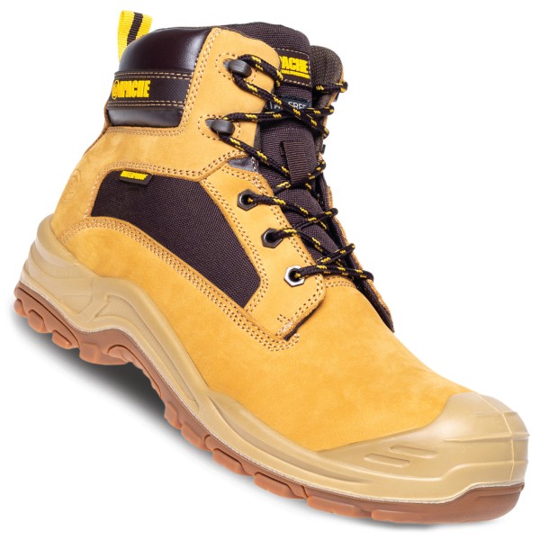 Honey nubuck leather upper. Non- metallic toe cap and midsole protection Waterproof and breathable inner lining. Anti-scuff toe protection. Heat resistant 300 degrees C PU/rubber outsole. 100% non-metallic. PU comfort insole. A tough boot for a harsh working environment.