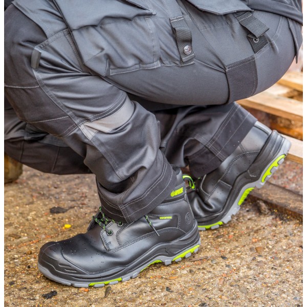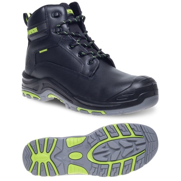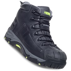 Black leather upper. Non- metallic toe cap and midsole protection Waterproof and breathable inner lining. Anti-scuff toe protection. Heat resistant 300 degrees C PU/rubber outsole. 100% non-metallic. PU comfort insole. A tough boot for a harsh working environment.