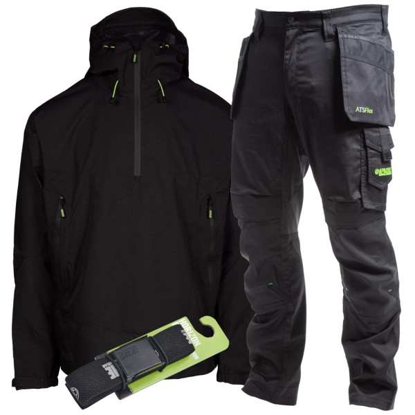 Apache ATS FLEX BANCROFT Stretch Work Trouser + WHITEROCK 1/4" Zip Rain Jacket + HORIZON Belt Bundle has been added to your cart