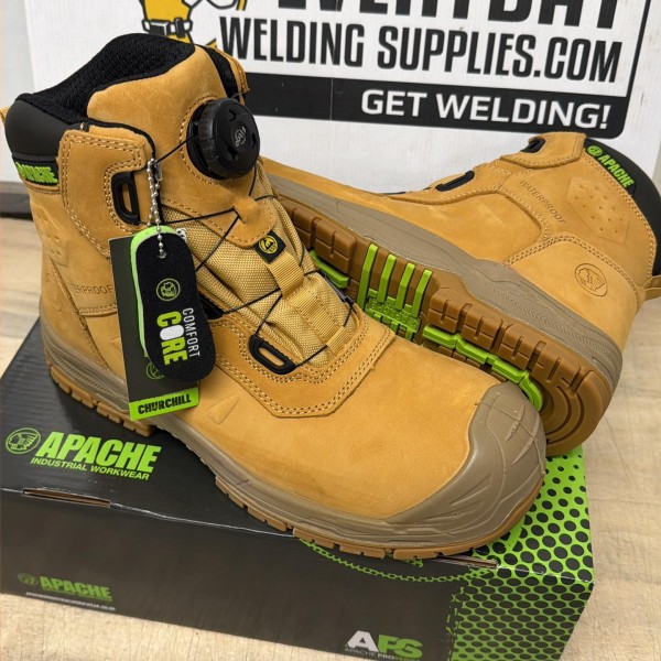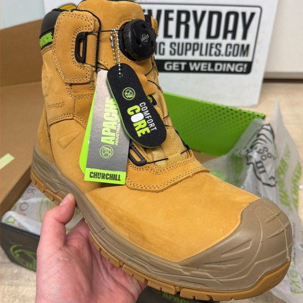Apache Churchill - premium protection meets everyday comfort. This wide-fit, ESD-rated safety boot features a wheat full grain leather upper and a waterproof, breathable bootie to keep feet dry whatever the weather. The Fitgo lacing system delivers quick, precise fit adjustments, while a lightweight composite toe cap and midsole offer reliable protection. Finished with a renowned Core Comfort footbed and tough scuff cap for durability, plus our GTS Grip Traction System PU/Rubber outsole, tested to heat resistance up to 300°C, fuel oil resistance, ladder grip, slip resistance, and both heat and cold insulation.