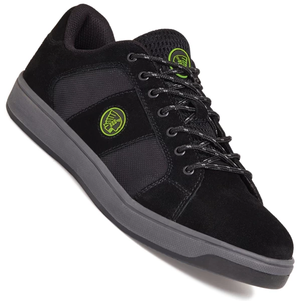 Black suede and canvas upper. Padded tongue and collar for added comfort. Steel toe cap protection and composite midsole protection. Lightweight EVA/rubber outsole. A retro styled cup sole safety trainer for light industrial applications.