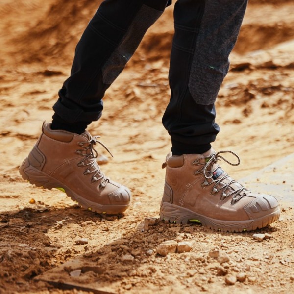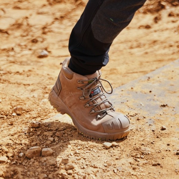Mercury Stone from Apache - the ultimate safety boot for tradespeople. This boot is 100% non-metallic, featuring a composite toe cap and composite midsole protection. With a waterproof and breathable inner liner, along with Thinsulate insulation, your feet stay dry and comfortable in any weather. The dual-density polyurethane outsole is certified for heat and oil resistance up to 300 degrees Celsius and is also resistant to fuel oil. It includes a scuff cap for added durability and boasts the highest slip rating certification. The Mercury Stone is a versatile and reliable waterproof safety boot, perfect for a wide range of outdoor applications.