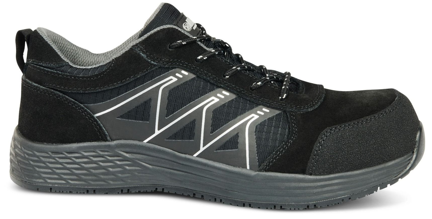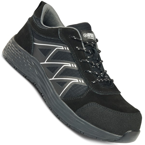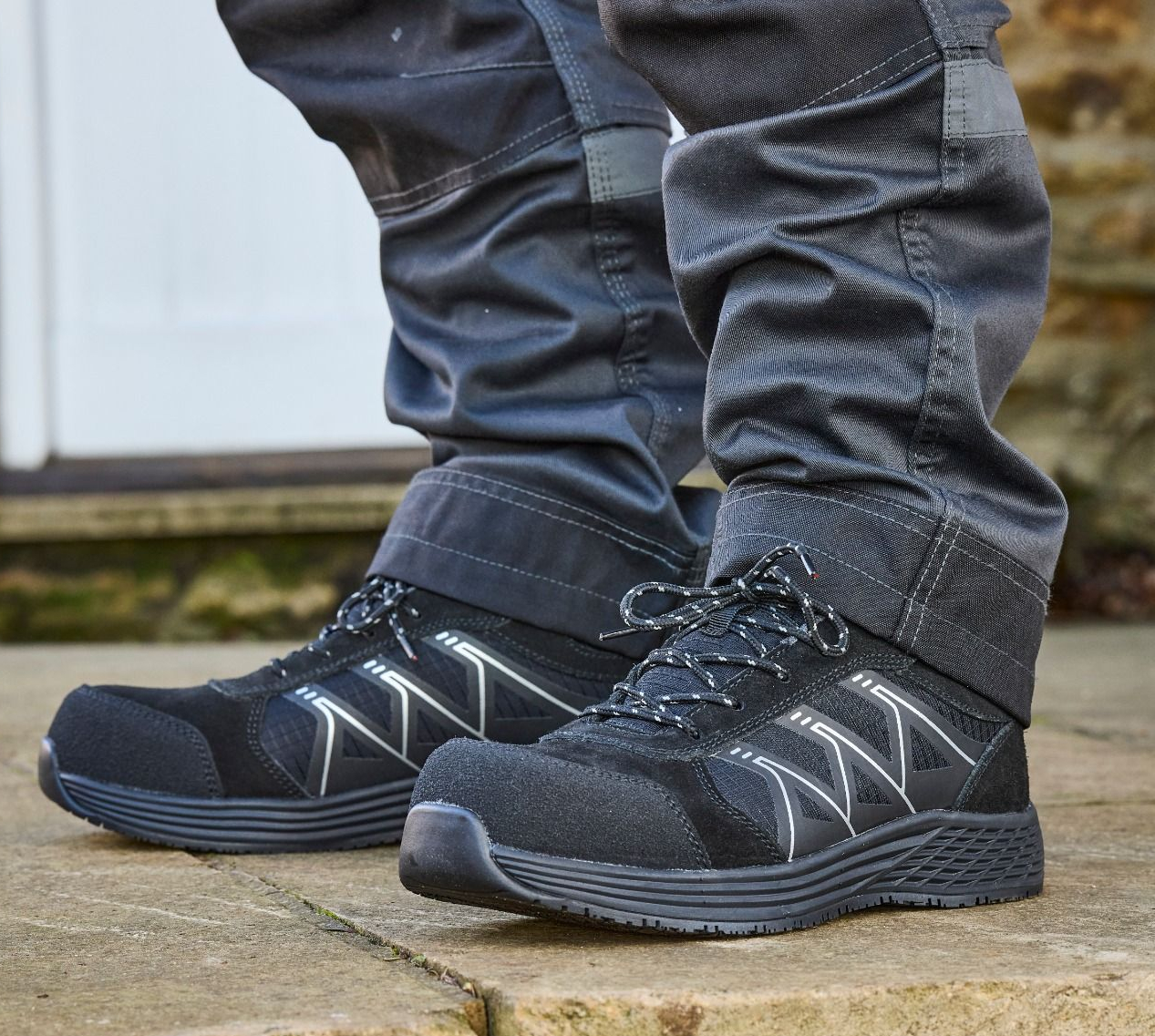 Synthetic/suede upper with padded tongue and collar. Composite toe cap protection. Composite midsole protection. Phylon/rubber outsole. A very lightweight and flexible stylish sports trainer for light industrial use. 100% Non – metallic.