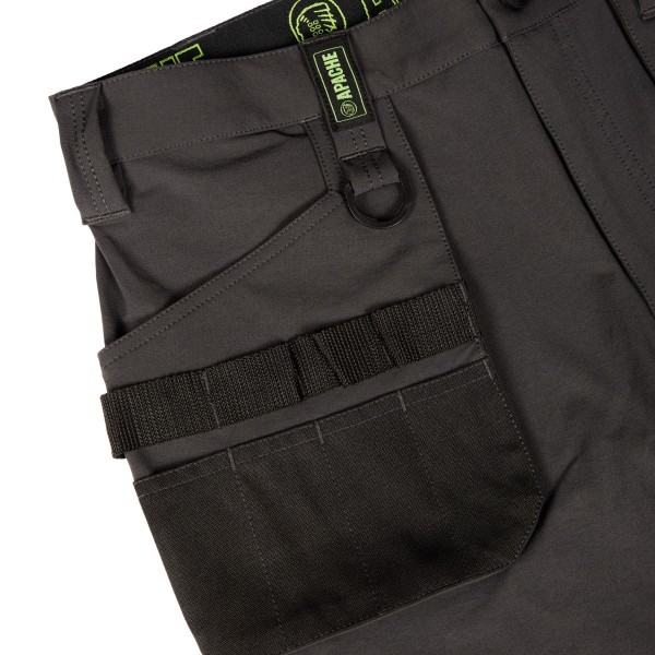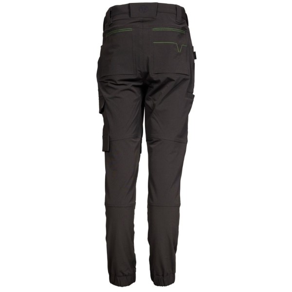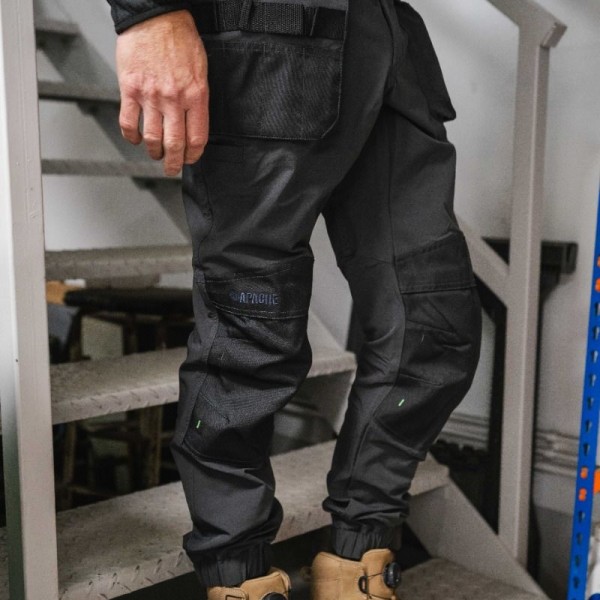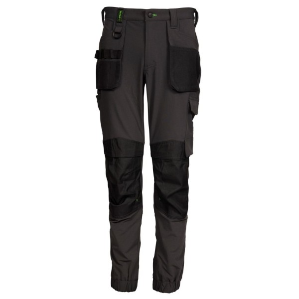 Yellowknife - slim-fit work trousers designed for flexibility and durability. Crafted from a 4-way stretch blend of 92% nylon and 8% elastane, these trousers offer abrasion resistance, water repellency, and excellent shape retention. Features include built-in holster pockets, shaped knee pad pockets, a floating cargo pocket on the left leg, rear inset pockets, and an elasticated hem for a secure fit. Perfect for trades needing both comfort and function on the move.