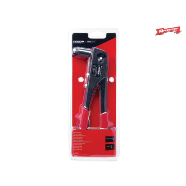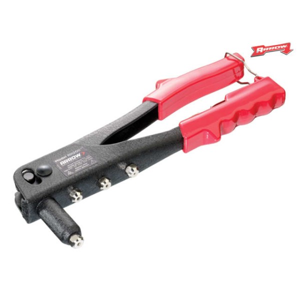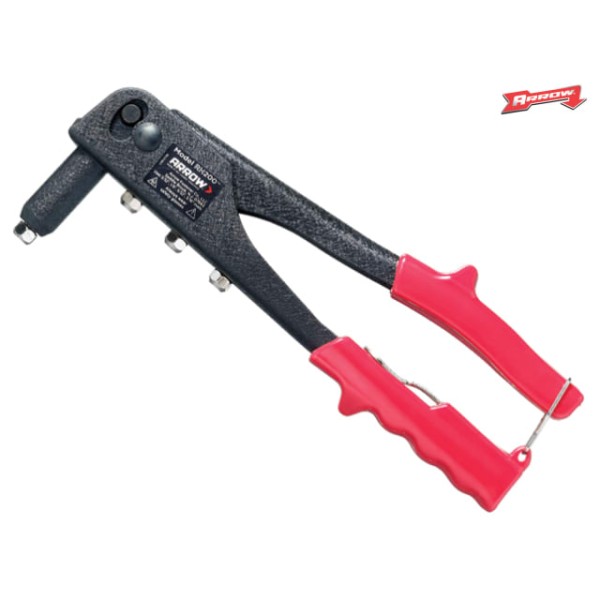 A professional all steel construction riveter with comfortable vinyl grip.Spring loaded handle for easy rivet loading and ejection.Extended nose for hard-to-get at places and will lock when not in use.Complete with four nosepieces to take 3/32, 1/8, 5/32 and 3/16 rivets.