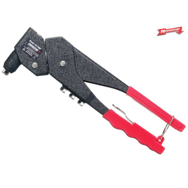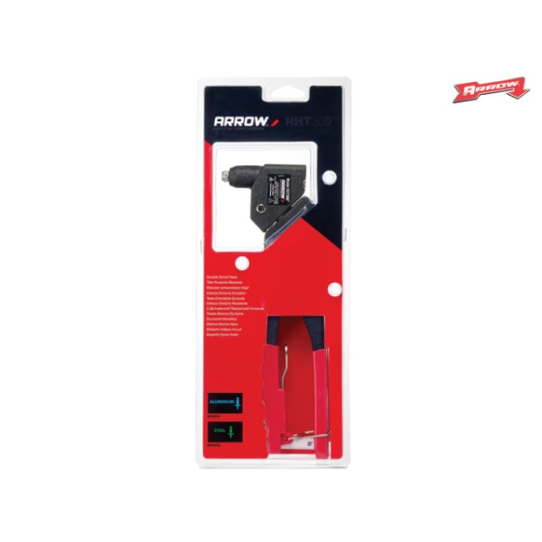 The Arrow RHT300 Rivet Tool with a head that rotates through 360° for riveting at any angle. It has an all-steel construction with a non-slip, vinyl grip. The rivet tool has a spring-loaded handle for easy rivet loading and ejection.