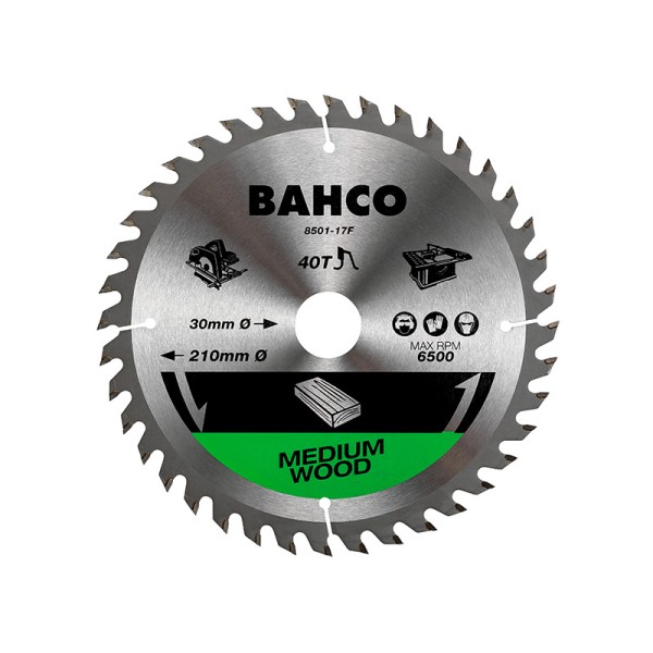 Bahco 8501-P/T Tungsten Carbide Tipped Circular Saw Blades for Portable/Table Saw Machines in wood applications. Made from hardened cold-rolled steel, these blades have expansion slots to take up the expansion of the steel when in use. Positive hook angle. An ATB tooth grind provides a clean finish. Suitable for both rip and cross-cutting in wood.