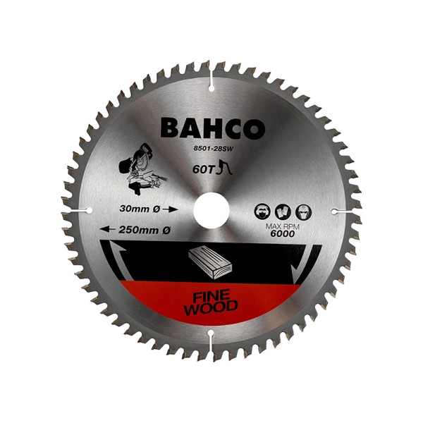 Bahco 8501-M Tungsten Carbide Tipped Circular Saw Blades for Mitre Saws Machines in wood applications. Made from hardened cold-rolled steel, these blades have expansion slots to take up the expansion of the steel when in use. 0° neutral hook angle. An ATB tooth grind provides a clean finish. Suitable for both rip and cross-cutting in wood.