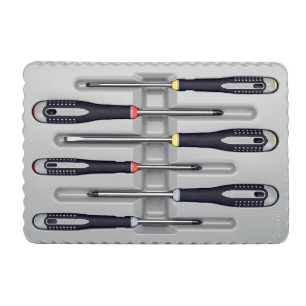 The Bahco BE-9884 ERGO™ Screwdrivers, in a set of 6, have been developed according to the scientific ERGO™ process. The high-performance alloy steel blade has been chrome plated and entirely hardened for high protection against corrosion, a long life tool. A black oxide tip provides higher accuracy.