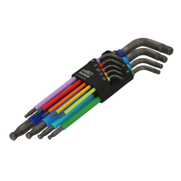 The Bahco C1997LM/9P Metric Long Ball End Coloured Hex L-Key Set, 9 piece, is ideal for driving bolts and screws which have hexagonal sockets. Long arms ensure excellent leverage, which makes driving easier.