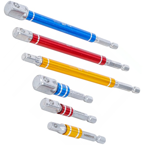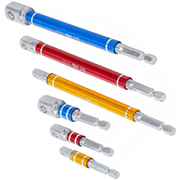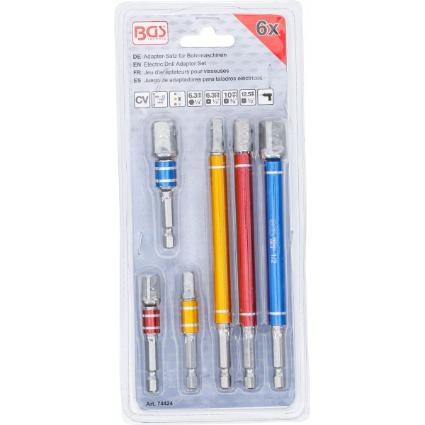 The perfect companion for assembly and installation work, the BGS Technic Electric Drill Adaptor Set ensures you're always equipped with the right adapter. Suitable for use with electric drills (without impact function) and cordless screwdrivers, this set is designed for quick-action and standard drill chucks. Each adapter features a color-coded shaft for easy identification of output profiles, making your tasks faster and more efficient.