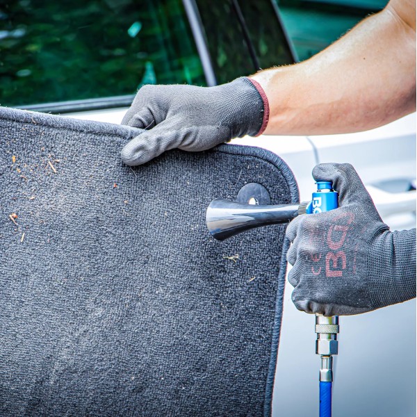 Efficiently clean dirty surfaces like seat upholstery, wheel houses, and vehicle floor mats with the BGS Technic Turbo Air Blow Gun. Its powerful swirl nozzle delivers a strong jet of compressed air, making it ideal for hard-to-reach areas such as air vents, seat rails, and door compartments. Compact and easy to handle, this tool is perfect for precision cleaning, utilising the physical turbulence effect for optimal performance.