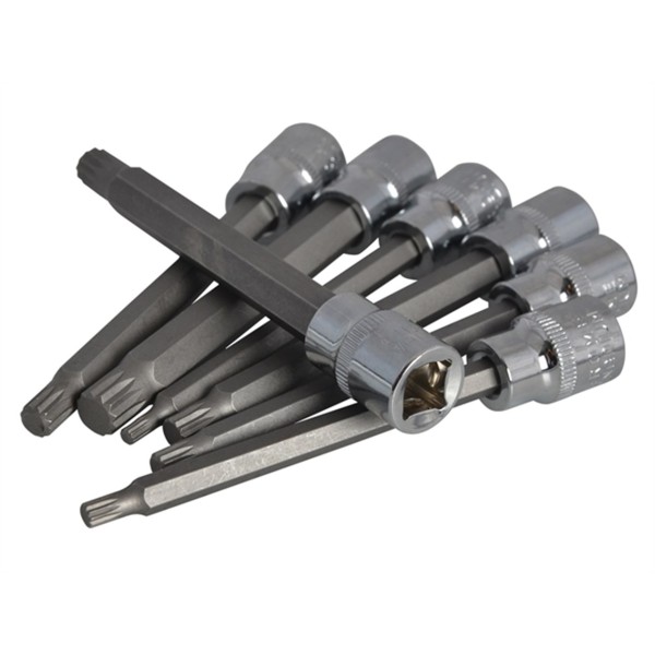 This Blue Spot Square Drive Spline Bit Socket Set contains 7 3/8in square drive spline bit sockets which are manufactured from chrome vanadium steel. They have extra long (110mm) shafts, making them ideal for hard to reach areas that conventional bits cannot reach.