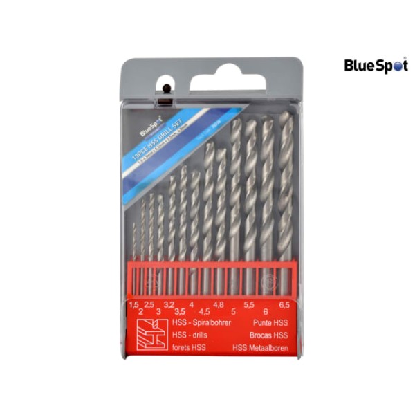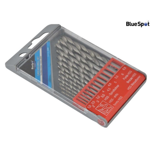 The BlueSpot Tools 13 Piece Twist Drill Set manufactured from High-Speed Steel (HSS), is ideal for drilling in steel, iron, non-ferrous metals, plastics and wood. Contains: