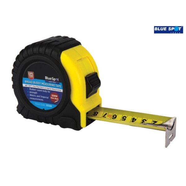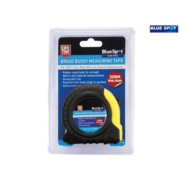 The BlueSpot Broad Buddy Pocket Tape has an extra wide steel blade with easy-to-read metric and imperial graduations. With a rubberised, impact resistant case for increased comfort. Its rubber casing improves strength and durability, and it has a strong belt clip to keep it conveniently to hand. A powerful lock holds the blade in position.