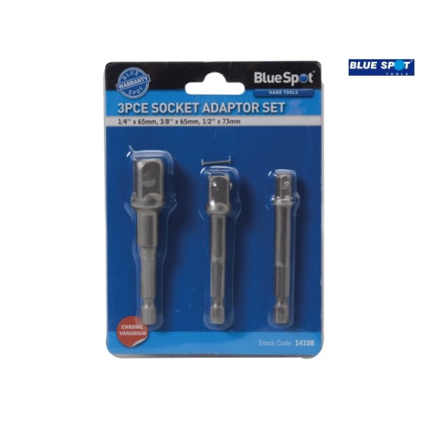 The BlueSpot Tools Socket Adaptor Set inculdes the three most popular sizes. Made from chrome vanadium steel with ball bearings for secure holding. For use with all power drills, cordless drills and screwdrivers with a 1/4in hex bit holder.