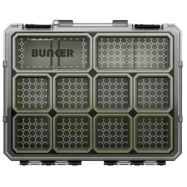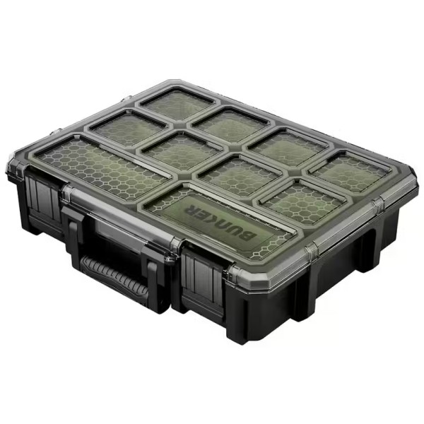 The large BUNKER tool storage organiser is made from durable, impact-resistant plastic. It features 10 removable bins securely held in the base of the case, providing efficient organisation of your tools and other items - eight square bins and two rectangular bins. The design of the lid, along with a secure latch, ensures that contents remain organised within the bins. Additionally, the lid is water resistant keeping the contents dry. The transparent lid allows for easy visibility of the stored items, and the molded grip makes it comfortable to carry.