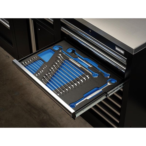 The BUNKER® open-end spanner tool set is produced by Deltach, a leading Dutch manufacturer of high-quality hand tools. This tool set is organised in EVA foam for protective storage within BUNKER® drawers. The dimensions of the EVA foam inlay are L 565 x W 397 x H 35mm, specifically designed to fit BUNKER® modular floor cabinets.
