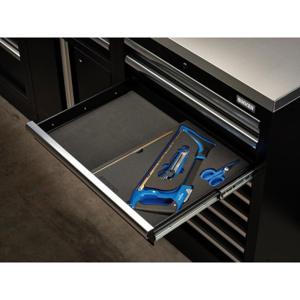 The BUNKER® saw and cutting set is produced by Deltach, a leading Dutch manufacturer of high-quality hand tools. It includes a hacksaw, scissors and retractable knife. Complete with four replacement saw blades and knife blades organised in EVA foam for protective storage within BUNKER® drawers. The dimensions of the EVA foam inlay are L 565 x W 397 x H 35mm, specifically designed to fit BUNKER® modular floor cabinets.