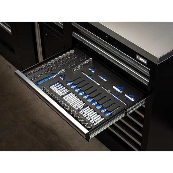 The BUNKER® socket set is produced by Deltach, a leading German manufacturer of high-quality hand tools. This tool set is organised in EVA foam for protective storage within BUNKER® drawers. The dimensions of the EVA foam inlay are L 565 x W 397 x H 35mm, specifically designed to fit BUNKER® modular floor cabinets.