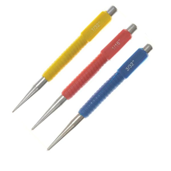 3 piece centre punch set manufactured from heat treated, finished alloy steel with a knurled body for a sure grip.
