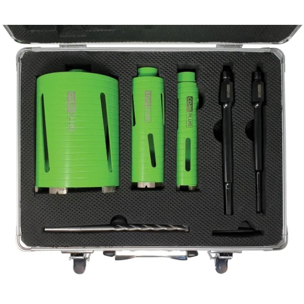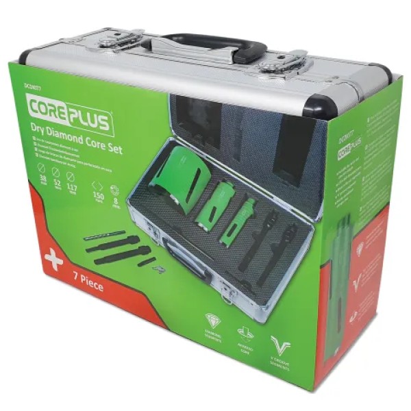 This 7 piece CorePlus Diamond Dry Core Drill Bit Set is supplied in a sturdy aluminium storage case.