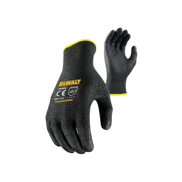The DEWALT DPG800L Touchscreen Cut Gloves have touchscreen capabilities in all fingers. Made from high performance polyethylene with a polyurethane-dipped palm which provides protection from abrasion, in both wet and dry conditions. The breathable back helps to keep hands cool in warmer weather. A seamless design and elasticated cuffs provide a comfortable fit.