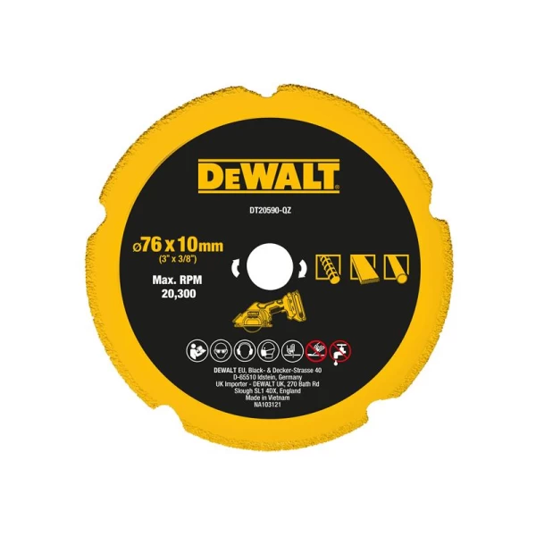 DEWALT DT20590 Diamond Multi Material Blade 75mm for cutting a wide range of materials including drywall, cement board, PVC/plastic, fibre glass, and metal.