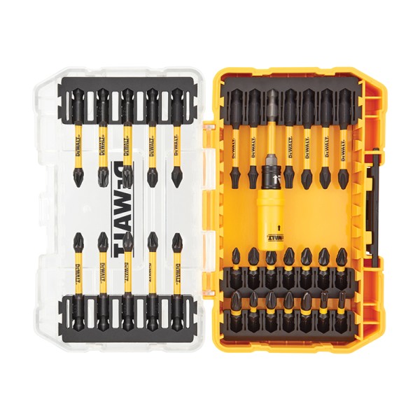 The DEWALT DT70737T FLEXTORQ™ Screwdriving Set contains a selection of EXTREME® FlexTorq™ screwdriving bits engineered for longer life. The built-in torsion zone has been designed to absorb and control high-impact forces, transferring them into the optimised geometry of the bit tip. Reducing the load on the driver and fastener, means secure fixing with longer life. The full fit head eliminates wobble and screw head rounding.