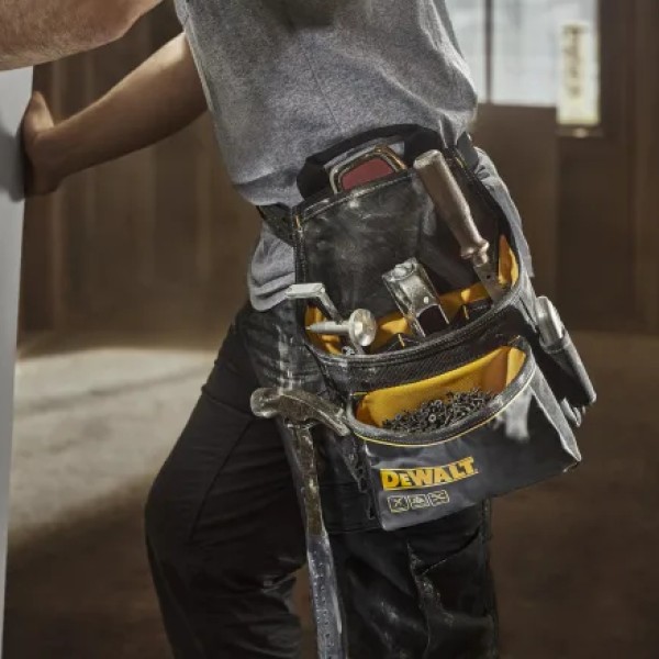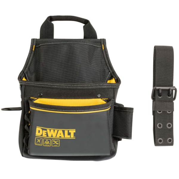 DEWALT DWST40101 Pro Single Pouch with various pockets; tape measure pouch, external screwdriver holder, protected pocket for jab saw and metal hammer loop. Its wide open structure allows for easy access whilst the internal high-vis lining lets you locate tools with ease.