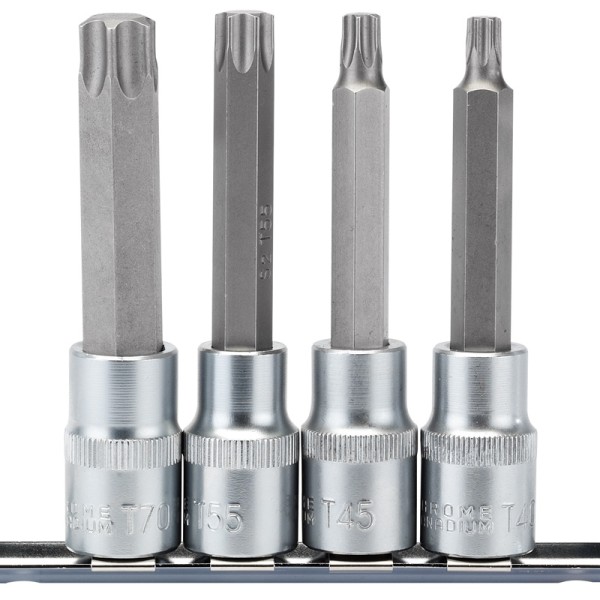 Expert Quality, 4 Draper TX-STAR® socket bits, 100mm long. All sockets manufactured from hardened and tempered chrome vanadium steel with sand blasted bits of S2 silicon steel. Each socket has a knurled ring for extra grip. Supplied on a steel socket retaining rail. Display packed.