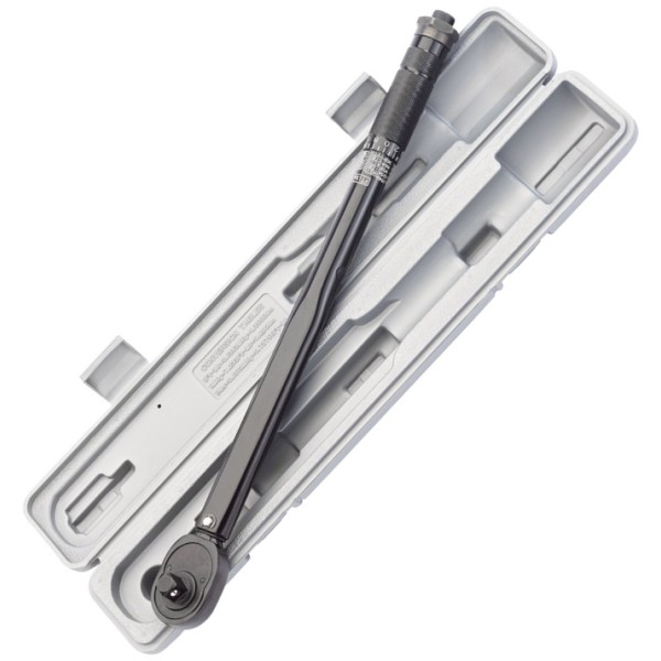 Reversible ratchet head. The in-lb and Nm scale is engraved on the barrel of the wrench. The micrometer type sleeve allows accurate preset torque values to be set. When torque is reached the wrench produces an audible click and a release of tension. Marked range: 30-210Nm/22.1-154.9 lb-ft. Supplied in blow mould storage case.