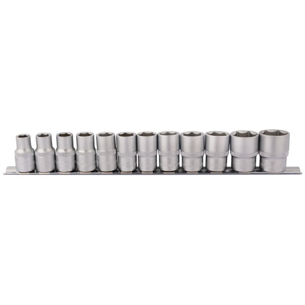 Manufactured from chrome vanadium steel, hardened and tempered with a satin finish. Each socket has a knurled ring for extra grip. Supplied on a metal socket rail for secure storage. Display packed.