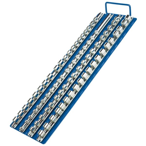 1/4", 3/8" and 1/2" square drive socket carrier made from pressed steel plate with fold down carrying handle. 430mm long socket retaining bars manufactured from carbon steel hardened and tempered with a polished finish. Display carton.
