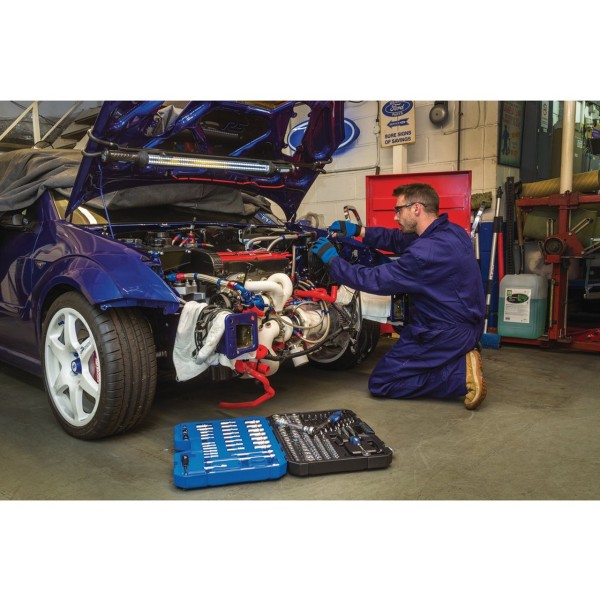 Six point socket made from chrome vanadium steel that's hardened and tempered with a micro satin finish. Each socket has a knurled ring for extra grip. Supplied with a 72 tooth reversible soft grip ratchet and accessories. Packed in a tough plastic storage case with soft grip handle.