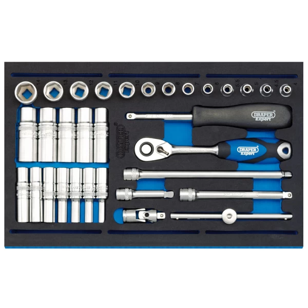 Expert Quality, sockets are manufactured from chrome vanadium steel, which is correctly hardened and tempered with a micro satin chrome plated finish. Each socket has a knurled ring for extra grip. Supplied with 72 tooth reversible soft grip ratchet and accessories. Supplied complete in a two tone 1/4 drawer EVA insert tray made from closed cell foam. Suitable to be used in Draper and Draper Expert tool chests and other manufacturers similar tool chests.