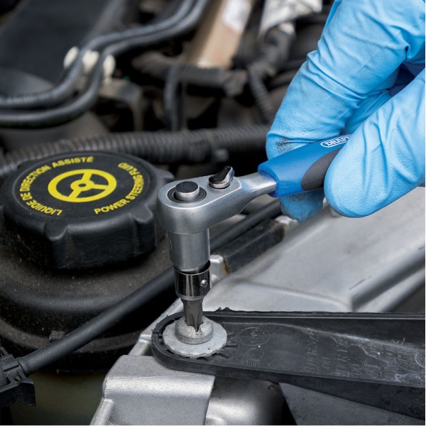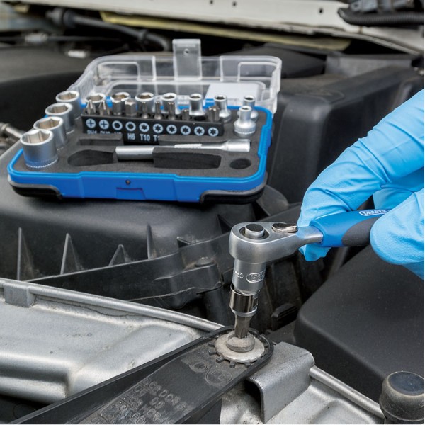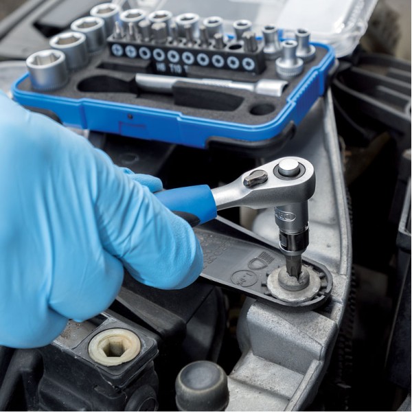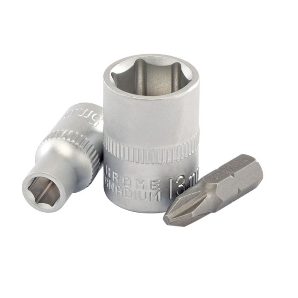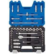 Six point sockets made from chrome vanadium steel that’s hardened and tempered with a satin finish. Supplied with a 72 tooth reversible soft grip ratchet and accessories. Packed in a plastic storage case.