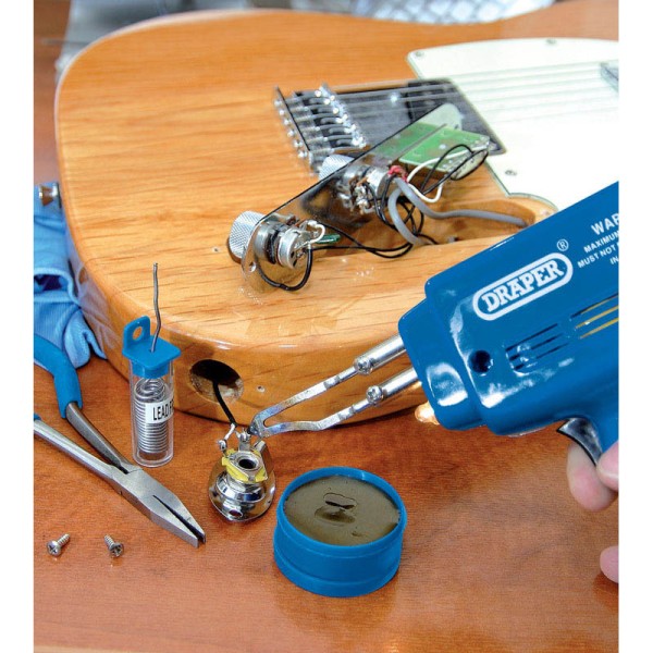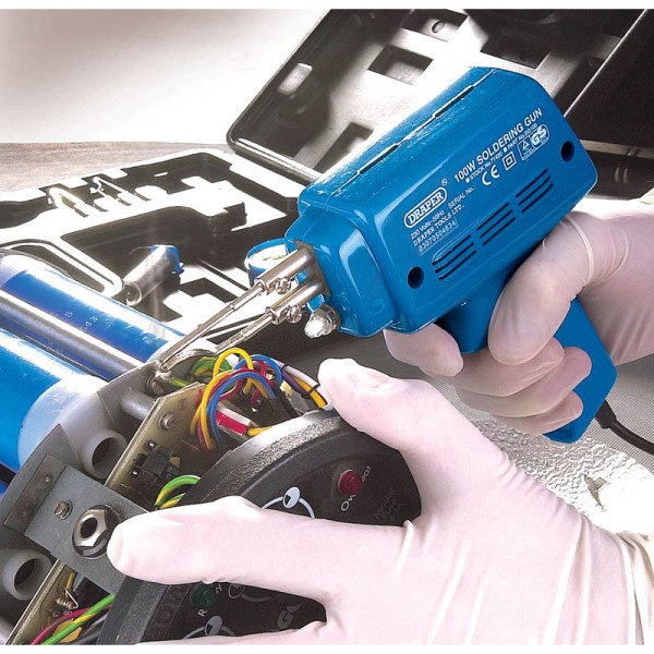 Comprising soldering gun with 1.2M (approx.) cable and approved plug, two spare tips, tube of solder and flux. Packed in blow mould case with display sleeve.