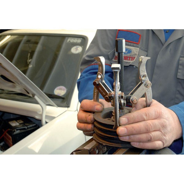 Puller with three reversible legs for external and internal pulling of gears, bearings, etc. Legs are forged carbon steel and have long and short reach facility. Yoke and thrust bolt are manufactured from carbon steel. Screw has a rolled thread with chemically blacked finish. Display packed.
