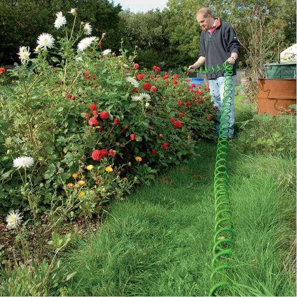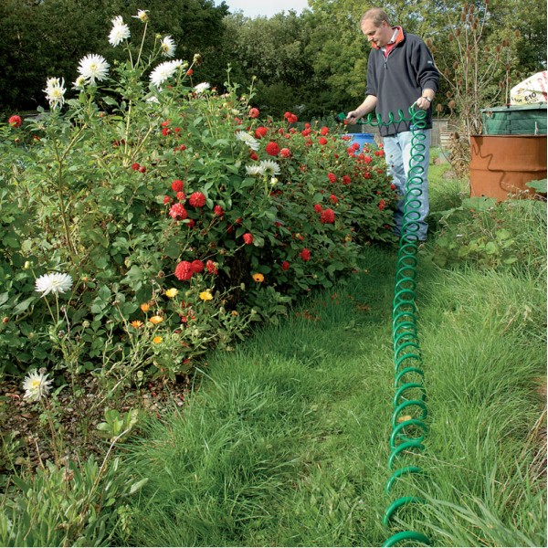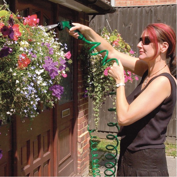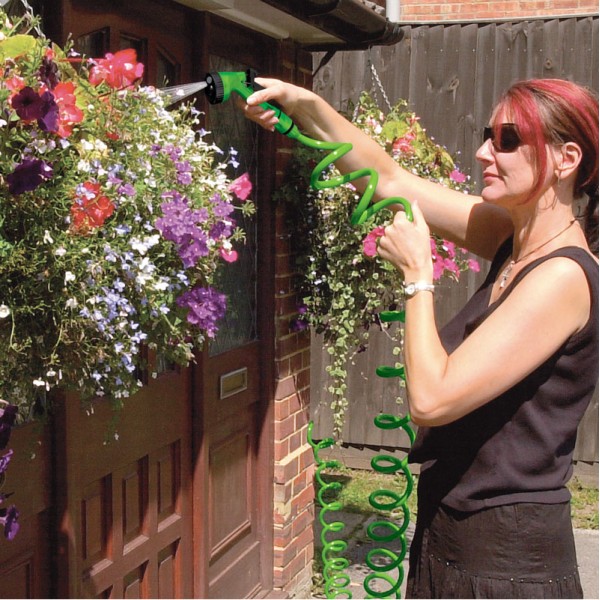 Hose kit comprising 10M 3/8" diameter recoil hose, 1/2" tap connector and five pattern spray gun. Display packed.