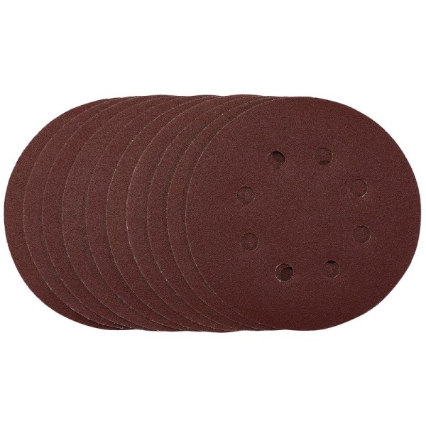 These premium quality aluminium oxide 125mm sanding discs are resin bonded to provide improved grain adhesion, anti-static qualities and long-lasting high performance. The heavy-duty E-Weight backing paper makes the sanding disc more durable – able to withstand the toughest jobs. The hook and loop backing offers decent adhesion to facilitate the fast changing of sanding discs. The eight pre-punched 8mm holes improve the dust extraction during sanding. Ideal for sanding and finishing wood, metal, aluminium alloy, painted surfaces, plastic and fillers. Compatible with all 125mm random orbital sanders with hook and loop backing pads.