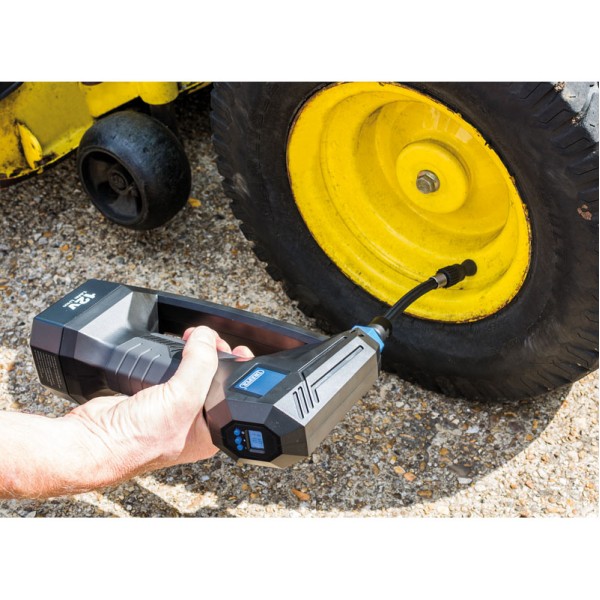 This cordless 12V air compressor has an LCD digital display, which provides PSI, KPA and BAR presets enabling the user to fix their desired air pressure. Once the set pressure is reached the compressor automatically stops. It is fitted with a bright LED lamp for visibility and an emergency red flashing SOS for attracting attention. Includes 150mm tyre valve connector/air hose and two inflation nozzles suitable for footballs, airbeds and inflatable toys. Supplied with 12V DC in-car power adaptor and mains charger inside a canvas storage bag.