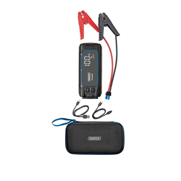 This powerful 12V lithium jump starter features an easy-to-read LCD display and is fully protected against short circuit, overload and reverse polarity. Its compact design allows for easy storage in a glovebox, and its lightweight construction makes it highly portable. Additionally, it includes an integrated emergency LED flashlight with three light functions - high/SOS/strobe. There is a built-in power bank for charging mobile devices on the go and it is equipped with 1 x USB-C port and x 2 USB ports. This jump starter is capable of starting all petrol engines or 10 litre diesel engine. Supplied inside a sturdy zip-case for convenient storage.