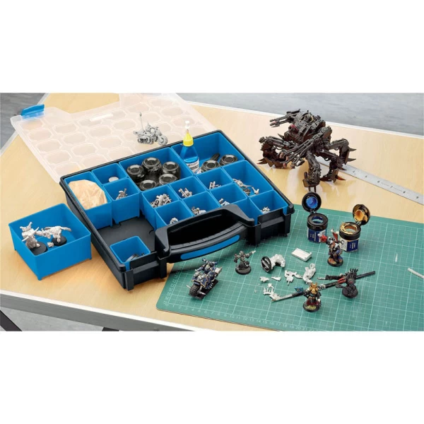 Plastic organiser with an adjustable matrix of lift-out storage compartments. Case has a carrying handle with 'snap fit' closures and clear lid. Sold loose.