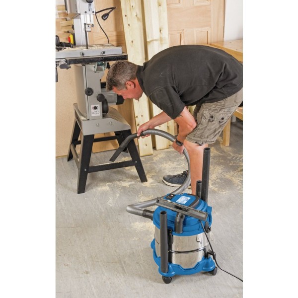 Designed to pick up wet and dry materials with a 15L tank volume and blower function. Ideally suited for use in the workshop, garage or DIY work around the home and garden. 5M (approx.) cable and approved plug. Fitted with on - board tool storage facility, castors for easy movability and a carry handle. Display carton.
