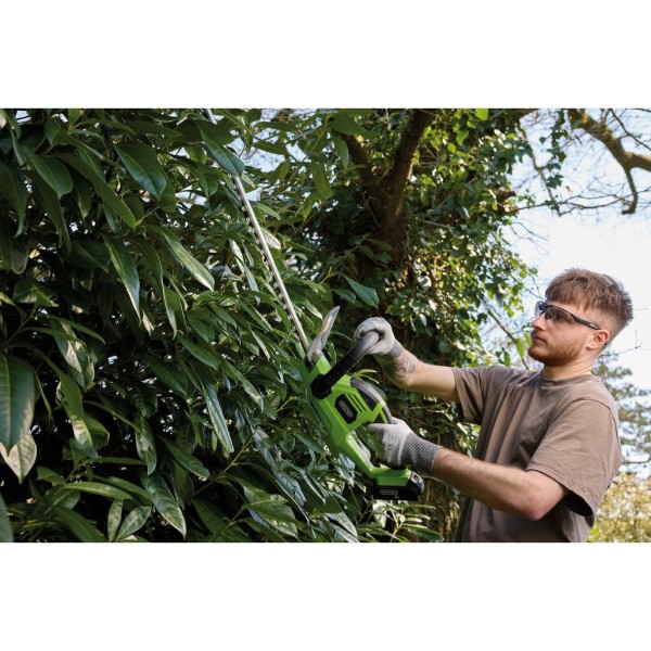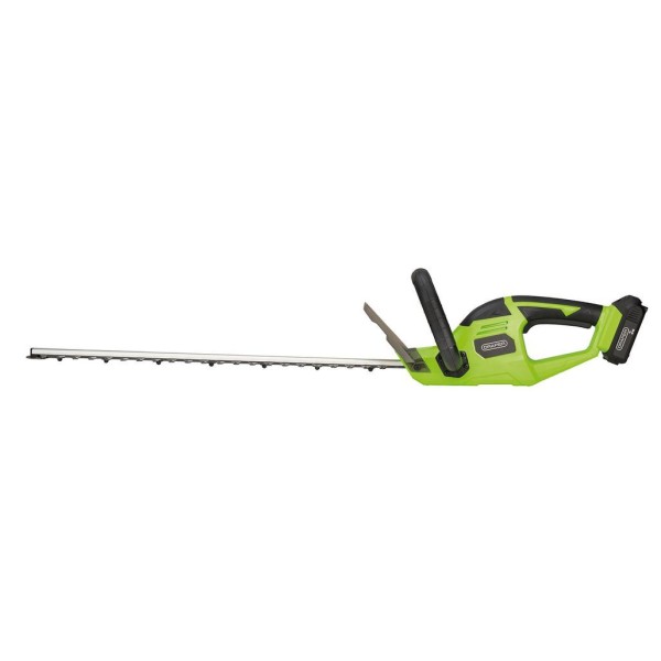 This cordless hedge trimmer efficiently cuts hedges, shrubs, and bushes with branches up to 17mm in diameter. The trimmer features an ergonomic handle and auxiliary grip for enhanced control. Includes a 2.0Ah Li-ion battery and charger.