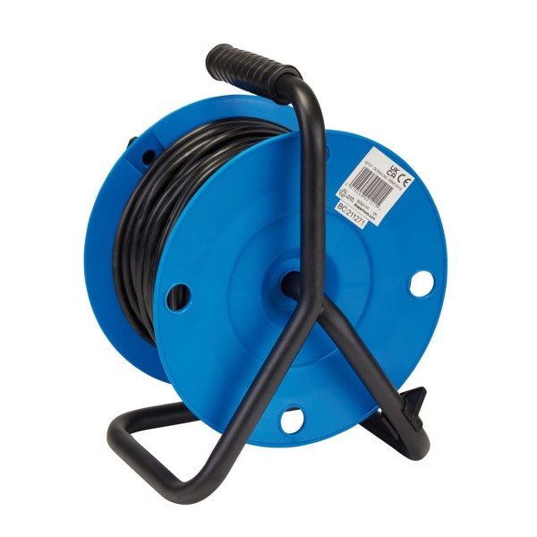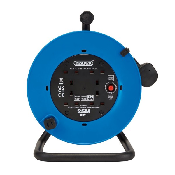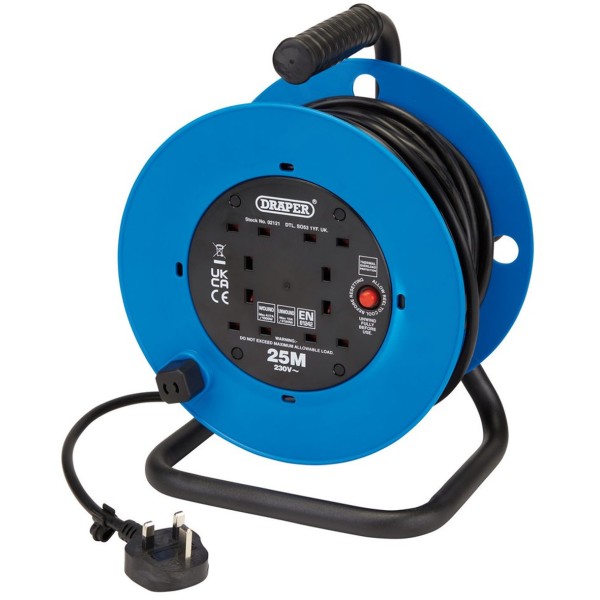 Industrial quality with a four socket plate. Sturdy metal frame with easy wind handle. Fitted with thermal cut out switch. 25m cable reel has 1.25mm cable and 50m cable reel has 1.5mm cable. Maximum load fully unwound 13A, 3120W. Fitted with approved plug. Sold loose.