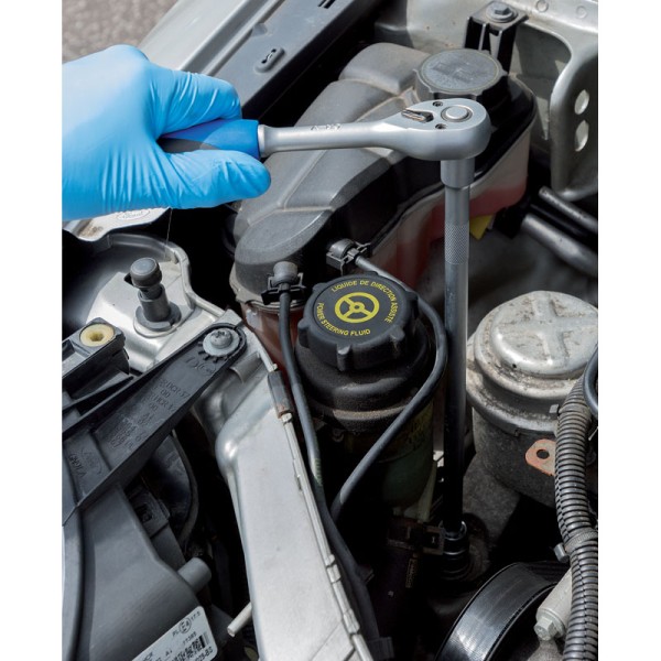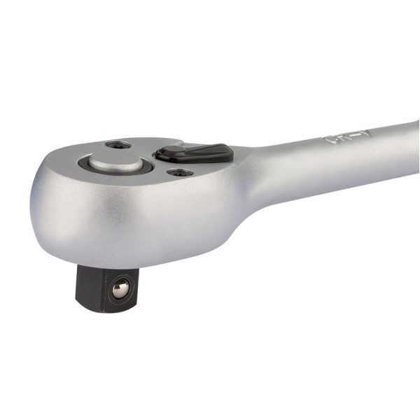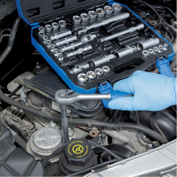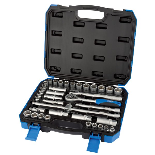 Six point sockets made from chrome vanadium steel that’s hardened and tempered with a satin finish. Supplied with a 72 tooth reversible soft grip ratchet and accessories. Packed in a plastic storage case.