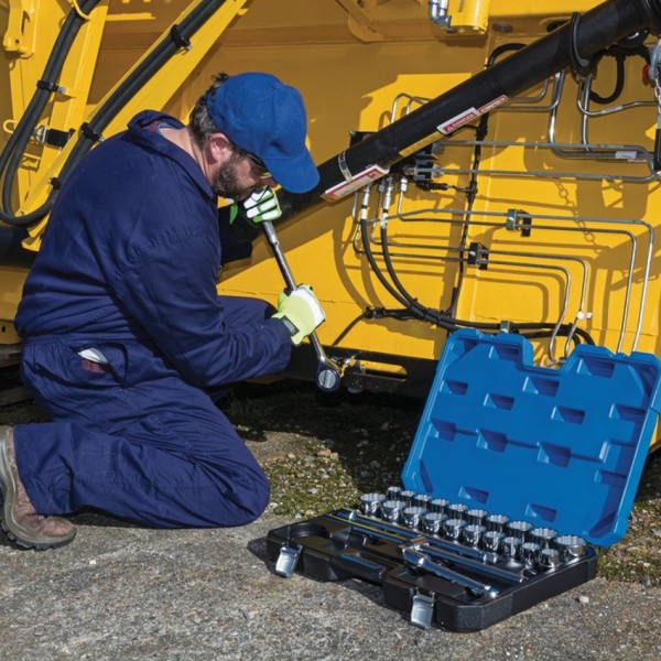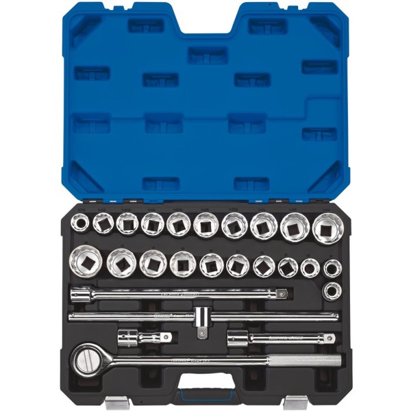 Twelve point socket made from chrome vanadium steel that's hardened and tempered with a polished finish. Supplied with a reversible ratchet and accessories. Packed in a tough plastic storage case with soft grip handle.